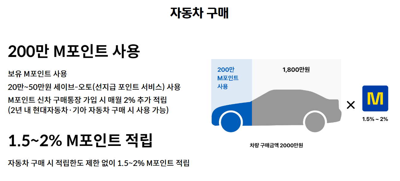 - M포인트 신차구매통장 : 누구나 가입하고 자동으로 통장포인트 월 2% 적립받고 신차 구매시 사용 가능