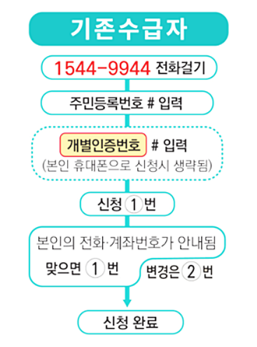 - 전화하여 신청대리 서비스 요청 (본인확인 후 신청가능하며 주민등록번호, 지급받을 본인 명의의 계좌번호 등을 사전 준비)